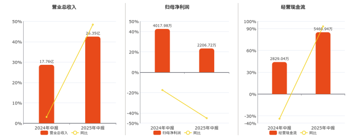 公司营业总收入为26.35亿元,在已披露的同业公司中排名第6,较去年同报告期营业总收入增加8.59亿元,实现2年连续上涨,同比较去年同期上涨48.39%。归母净利润为2206.72万元,在已披露的同业公司中排名第15,较去年同报告期归母净利润减少1811.26万元,同比较去年同期下降45.08%。经营活动现金净流入为5460.94万元,在已披露的同业公司中排名第9,较去年同报告期经营活动现金净流入增加2631.91万元,同比较去年同期上涨93.03%。